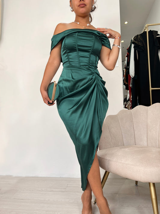 Green Satin Bustier Asym Midi Dress