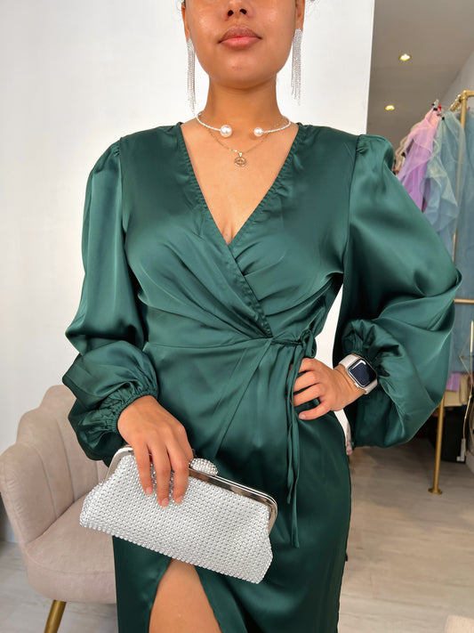 Green Satin Lantern Sleeve Dress