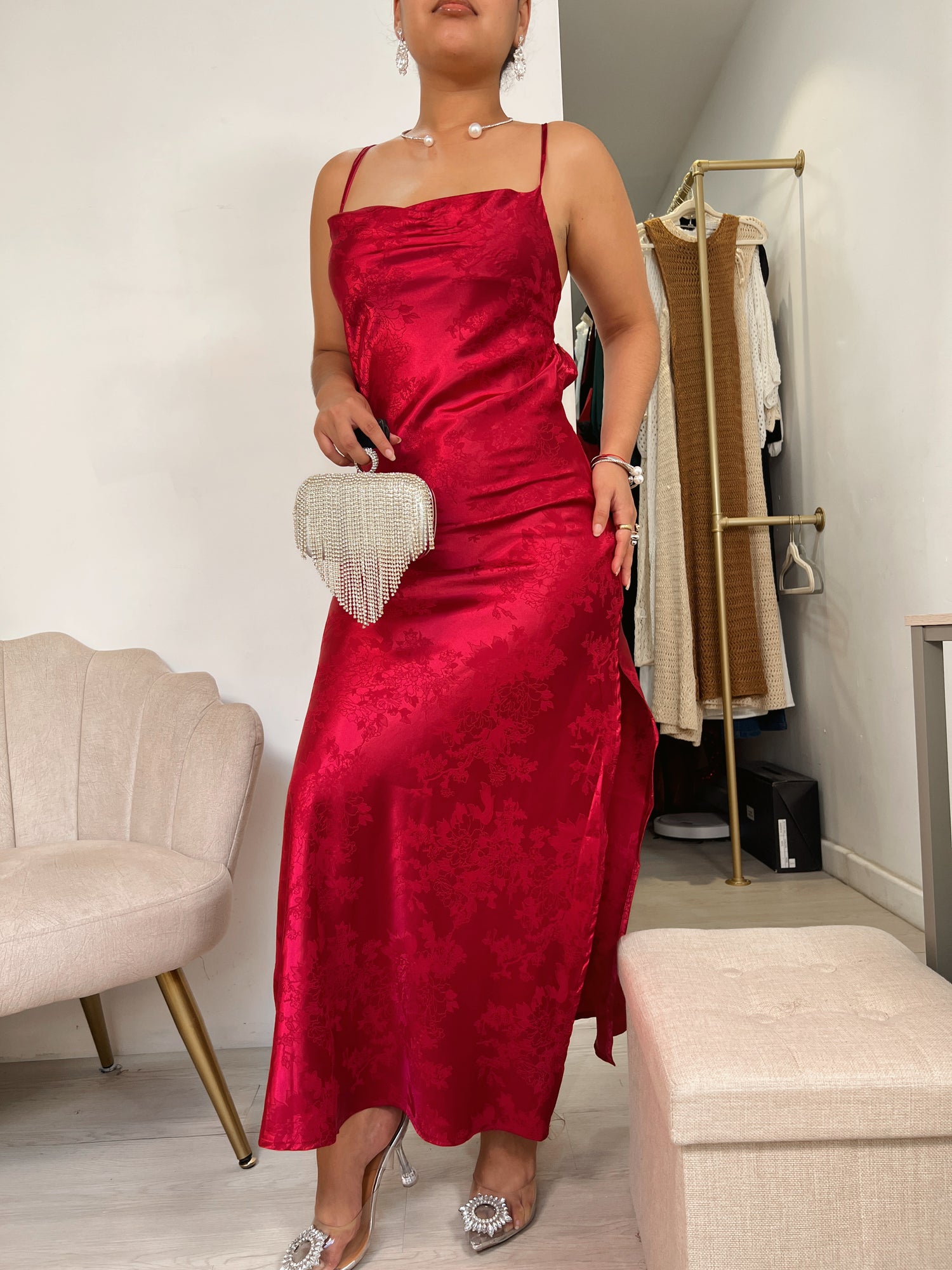 Dark Red Silk Rose Pattern Metallic Midi Dress