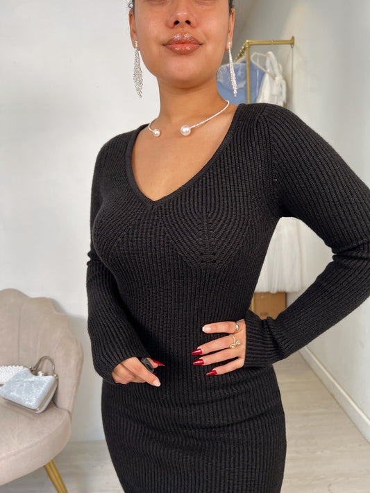 Black Rib-knit Sweater Midi Dress